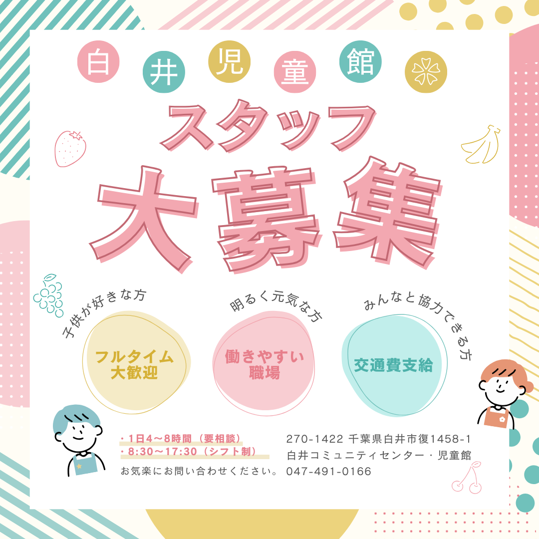 白井児童館では、一緒に働いてくださる方を募集しています。