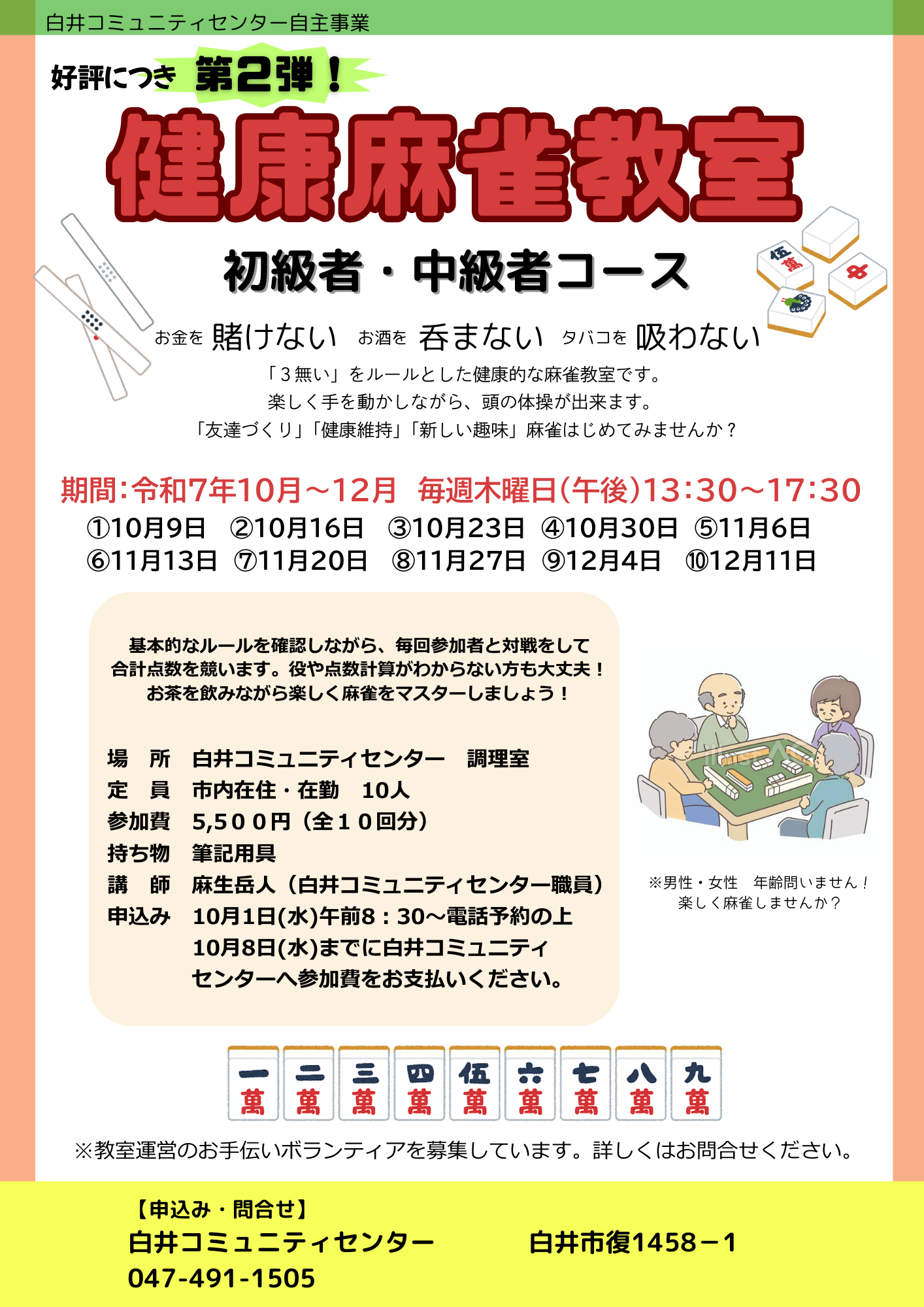 ご好評につき【健康麻雀教室(全10回)】を開講いたします。