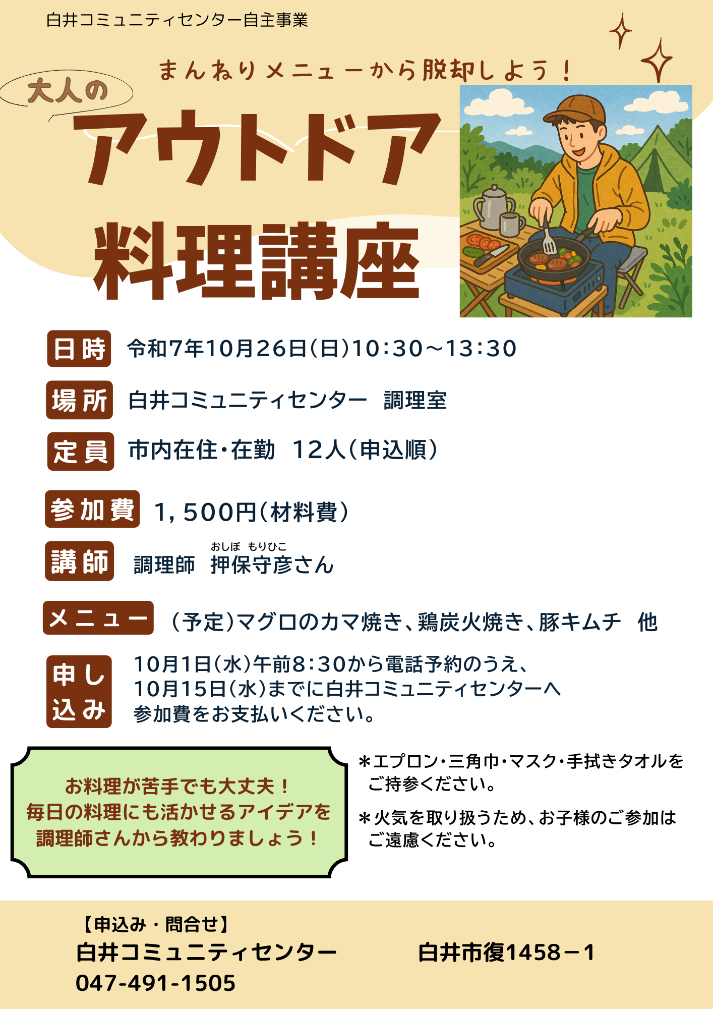 10月26日(日)に開催する【大人のアウトドア料理講座】のご案内です。
