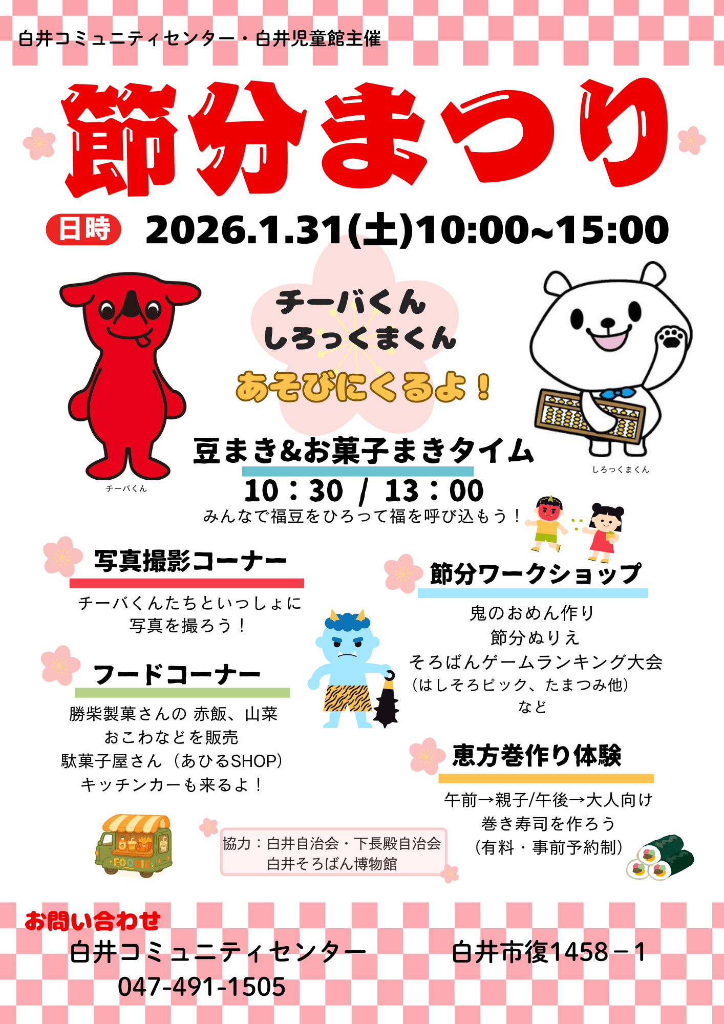 当日はチーバくん、しろっくまくんと一緒に豆まきをしましょう!一緒に写真も撮れます。