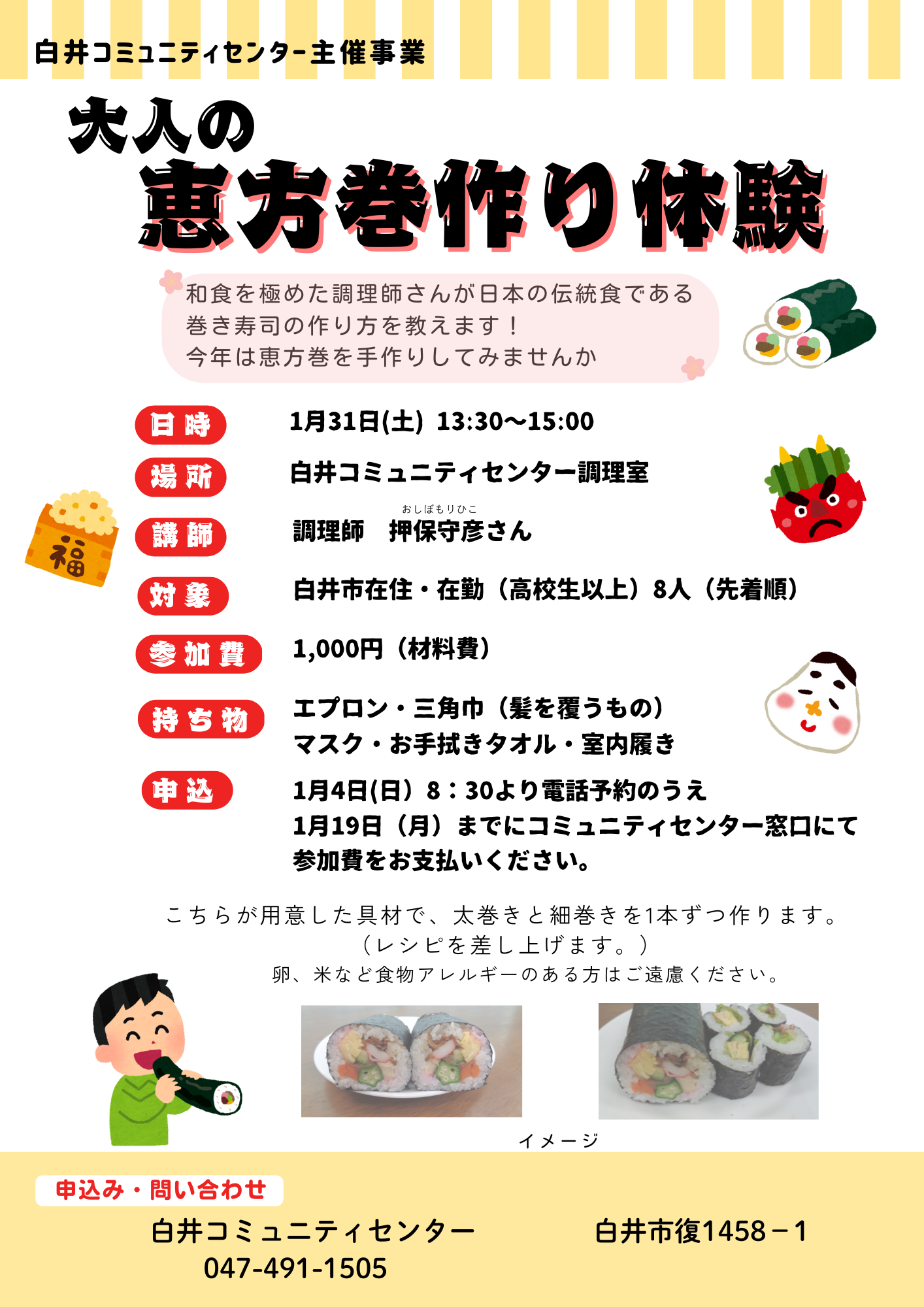 1月31日(土)に開催する【大人の恵方巻作り体験】のご案内です。